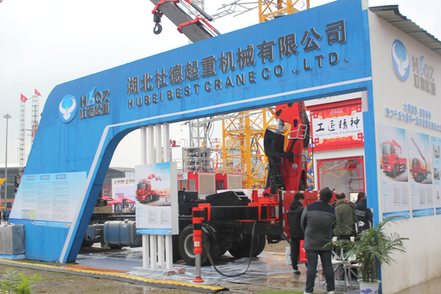 今天是10月15日,第120屆國際進出口交易會在廣州市海珠區(qū)如期舉行。 湖北杜德起重機械有限公司此次參展的是SQ1000ZB8+2,國內(nèi)第一臺10節(jié)臂的隨車吊,其新穎的外觀和高