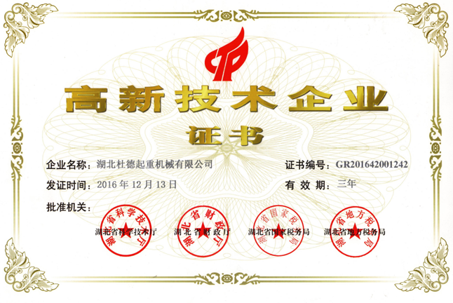 陽春三月,生機盎然,伴隨著來自全國各地紛至沓來的訂單,湖北杜德起重機械有限公司又傳喜訊佳音----根據(jù)國家《高新技術(shù)企業(yè)認(rèn)定管理辦法》的相關(guān)規(guī)定,憑借專業(yè)的研發(fā)